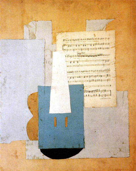 For example, the image below is using musical notation to communicate the music coming from the violin. Below that image are other, more contemporary synthetic cubist images.
